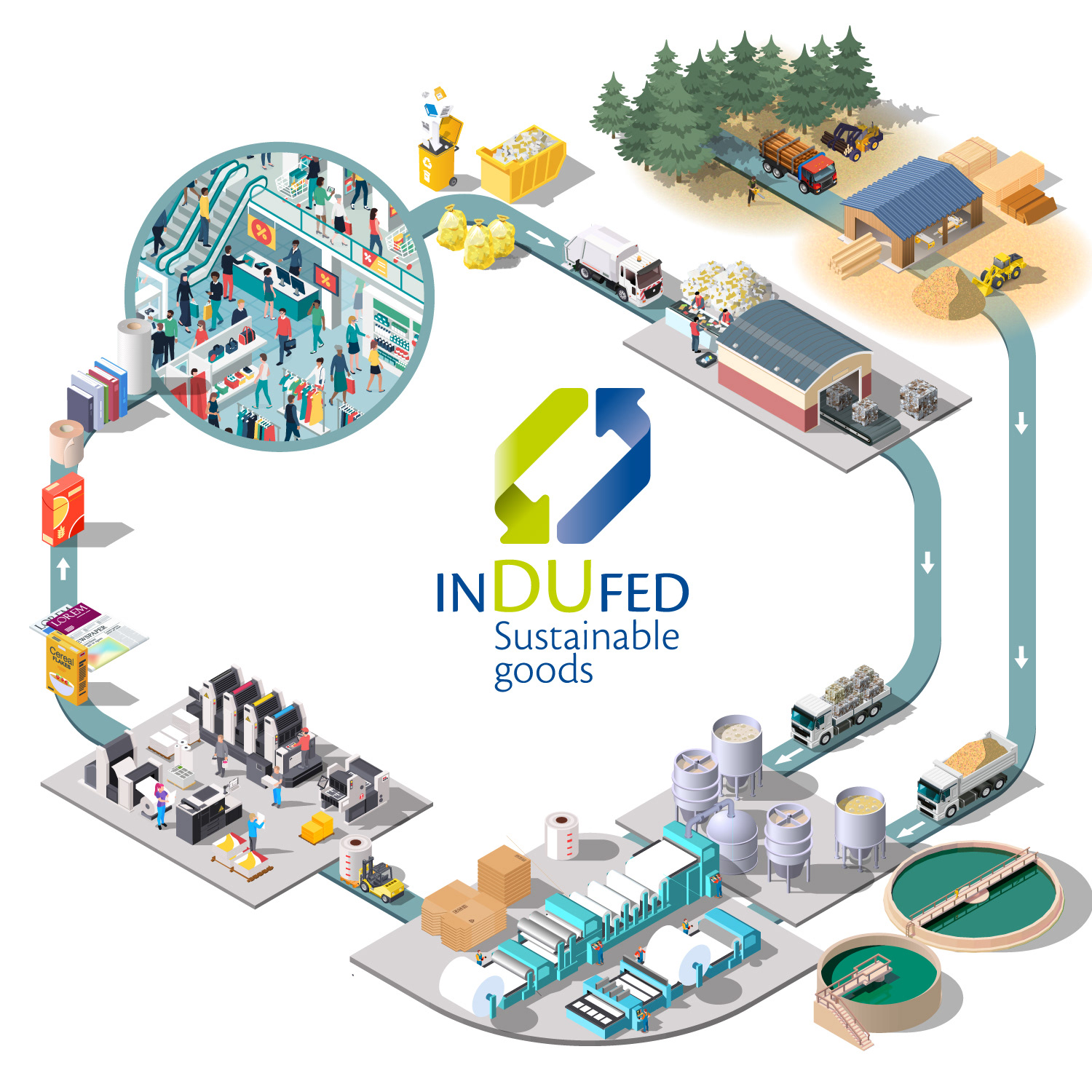 Isometric illustration of the paper and cardboard cycle